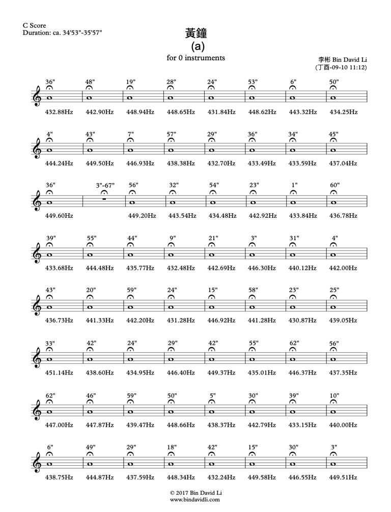 黄钟 (a) is a conceptual piece for zero instruments, whose meaning I choose not to fix in words. (See a perusal version of the score on the right.) The first interpretation was provided by Score Follower on YouTube: